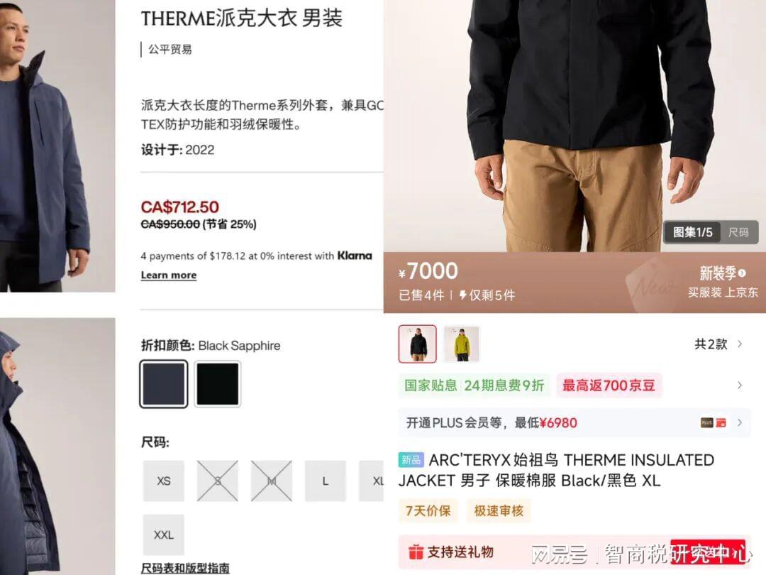 比如,在始祖鸟的老家加拿大,一件THERME棉服售价712.5加元,折合人民币约3700元;中国国内同款售价7000元,比加拿大贵了近一倍。