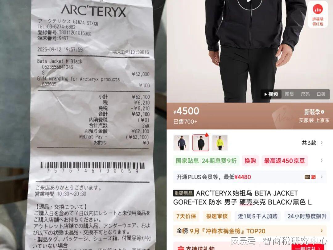 同时,网友小夫在日本东京,买到一件始祖鸟BETA Jacket,退税后价格62100日元,折合人民币约3000元;对比4500元的中国同款,比日本同样贵了1.5倍。