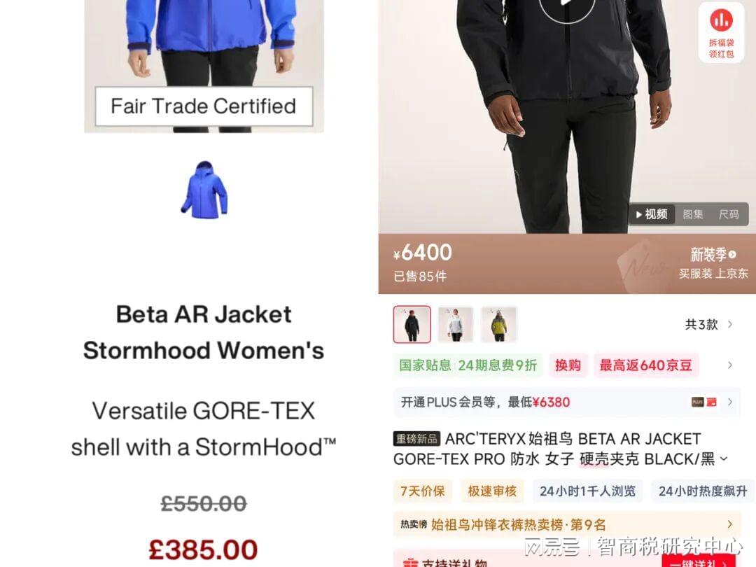 另一边,始祖鸟英国区官网奥莱板块,最近也上线了一批折扣商品。其中BETA AR Jacket售价385英镑,折合人民币约3700元;国内同款售价6400元,比英国贵了2700元。