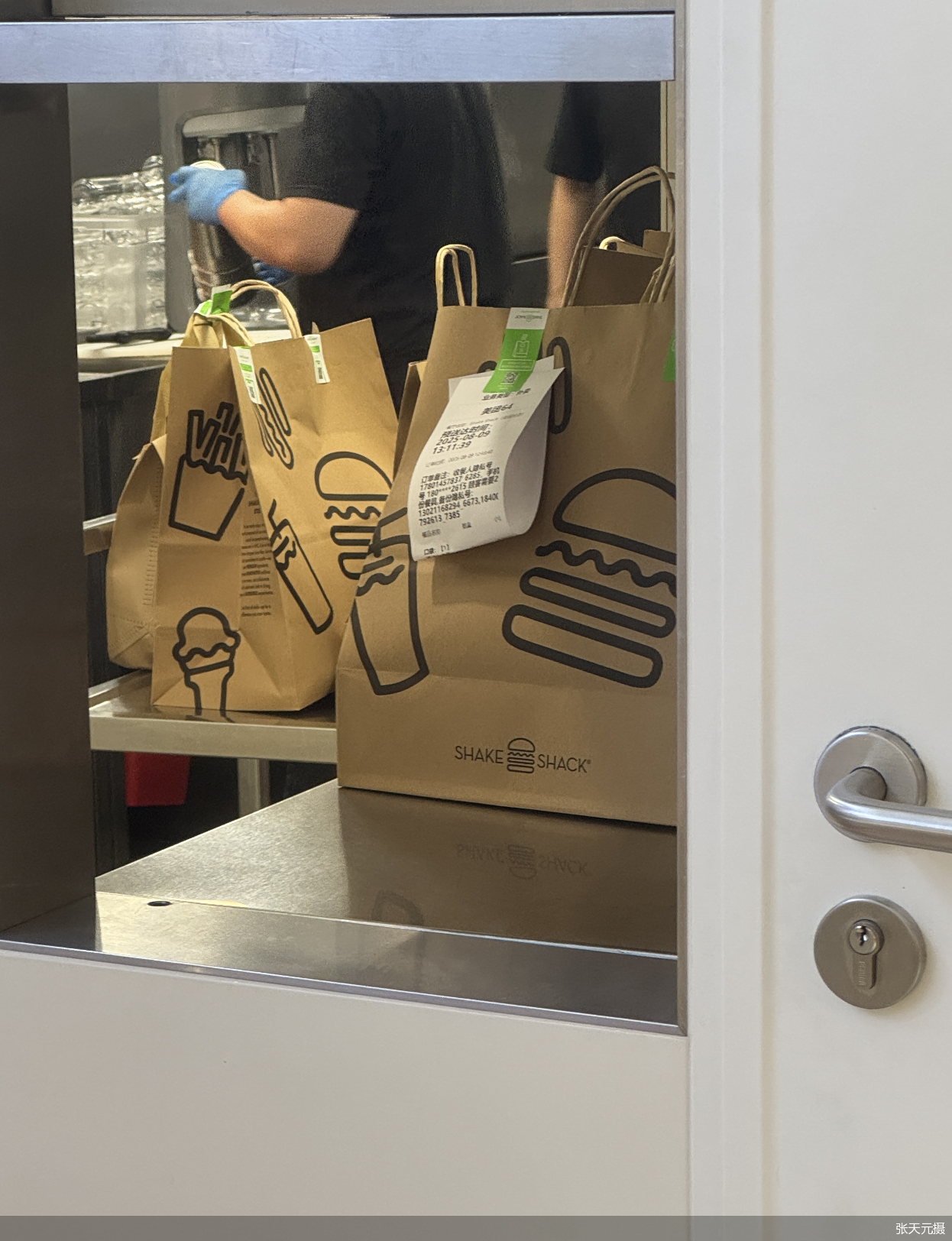 位于华堂.新辰汇的地下一层中,一家名为中央厨房的门店正生产着汉堡薯条等产品,小窗口前放着一袋又一袋准备好的外卖,再由骑手送到消费者手中,这就是Shake Shack新店型的模式。从现场看来,该门店面积并不大,除了取餐口之外,门上的玻璃窗能够看到门店内店员忙碌的身影,门头“Shake Shack昔客堡”的字样较显眼,并未提供堂食服务。