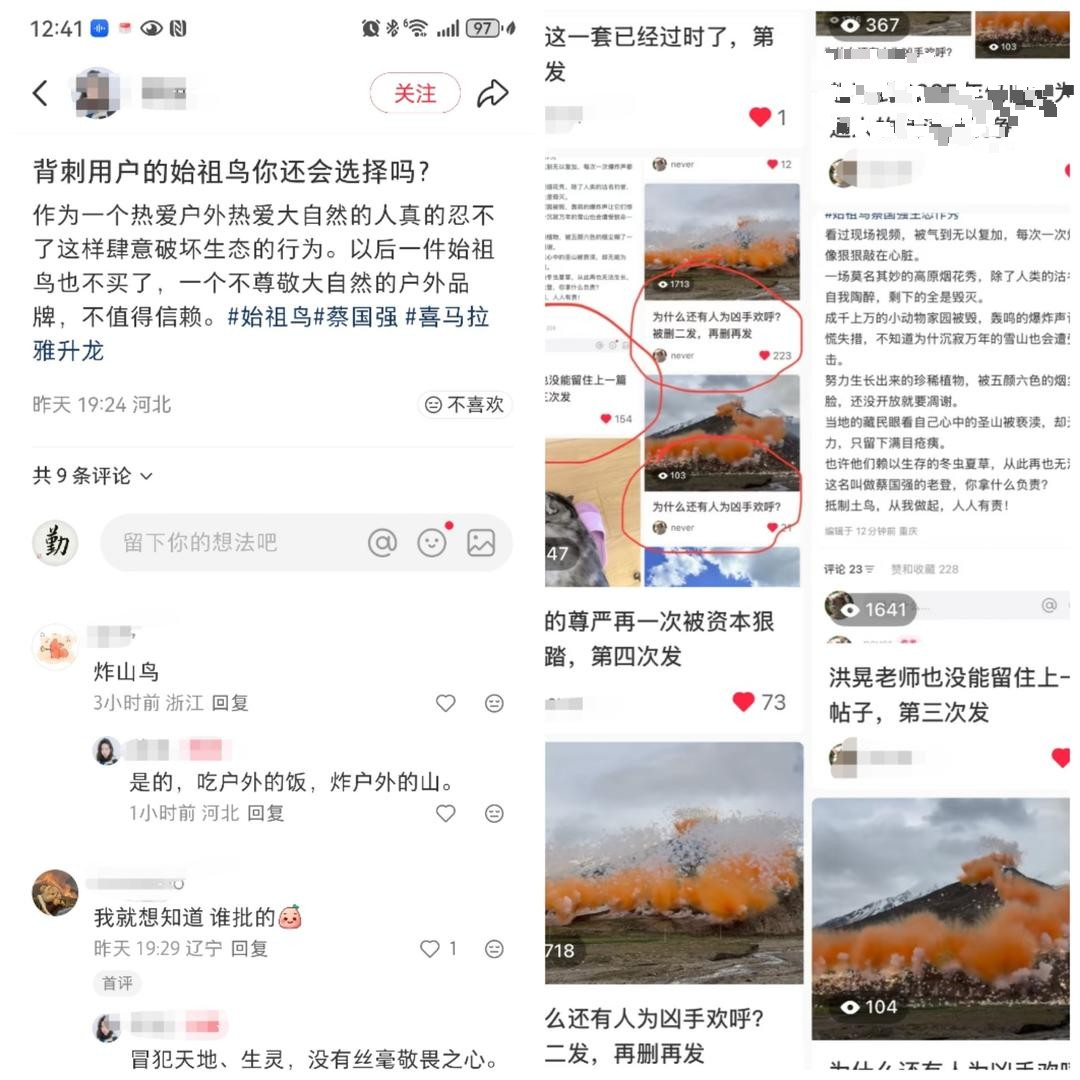 网友们都表达了自己的愤怒,说都得处理,尤其是对蔡国强只和始祖鸟只进行数倍高额罚款:对当地相关部门进行处理。秦岭事件只和爆炸喜马拉雅山脉同出一辙!即便是罚没到倾家荡产也恢复不了生态环境了!
