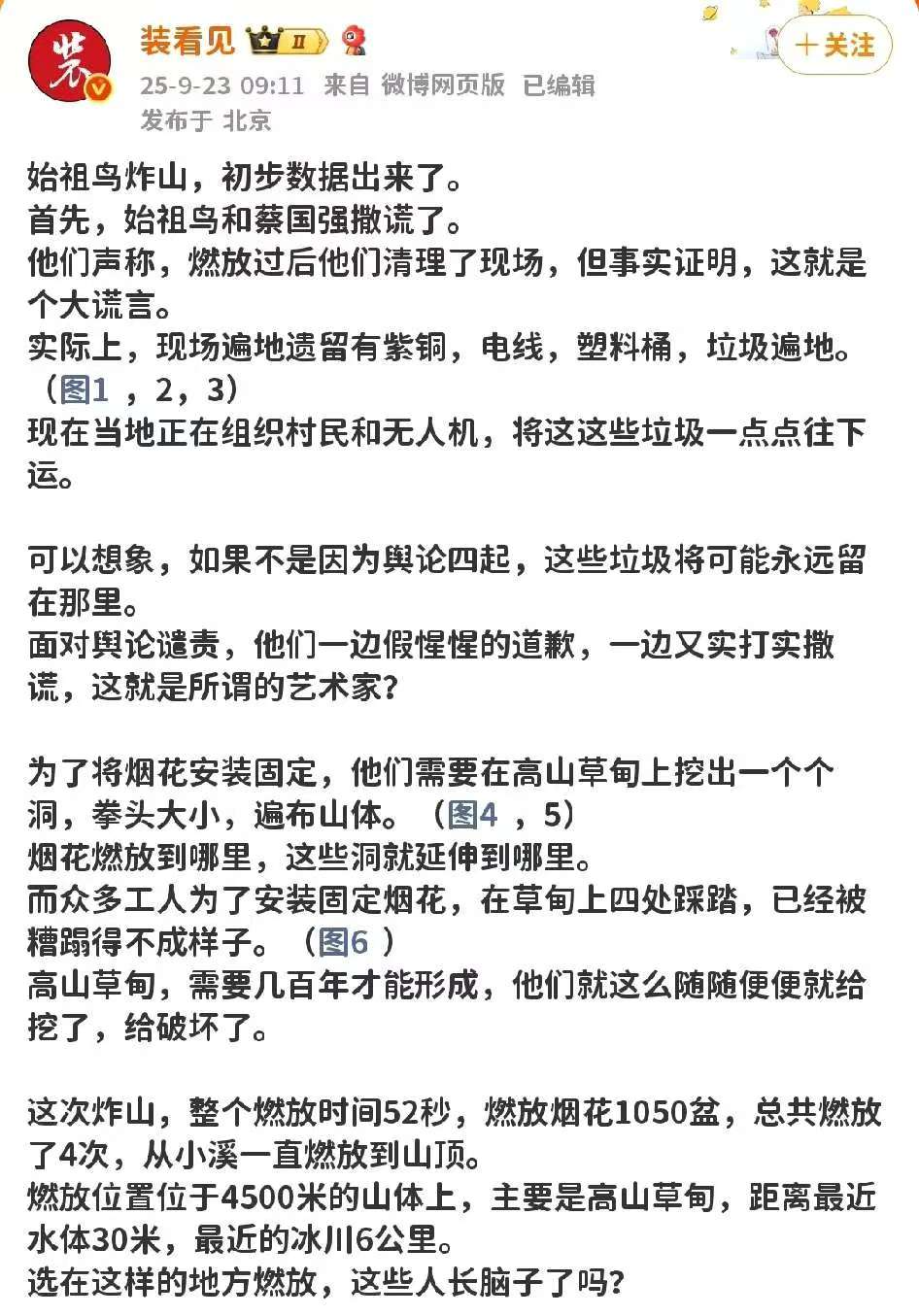 始祖鸟炸山,初步数据出来了。首先,始祖鸟和蔡国强撒谎了。他们声称,燃放过后他们清理了现场,但事实证明,这就是个大谎言。实际上,现场遍地遗留有紫铜,电线,塑料桶,垃圾遍地。(图1,2,3)现在当地正在组织村民和无人机,将这这些垃圾一点点往下运。可以想象,如果不是因为舆论四起,这些垃圾将可能永远留在那里。面对舆论谴责,他们一边假惺惺的道歉,一边又实打实撒谎,这就是所谓的艺术家?为了将烟花安装固定,他们需要在高山草甸上挖出一个个洞,拳头大小,遍布山体。(图4,5)烟花燃放到哪里,这些洞就延伸到哪里。而众多工人为了安装固定烟花,在草甸上四处踩踏,已经被糟蹋得不成样子。(图6)高山草甸,需要几百年才能形成,他们就这么随随便便就给挖了,给破坏了。这次炸山,整个燃放时间52秒,燃放烟花1050盆,总共燃放了4次,从小溪一直燃放到山顶。燃放位置位于4500米的山体上,主要是高山草甸,距离最近水体30米,最近的冰川6公里。选在这样的地方燃放,这些人长脑子了吗?