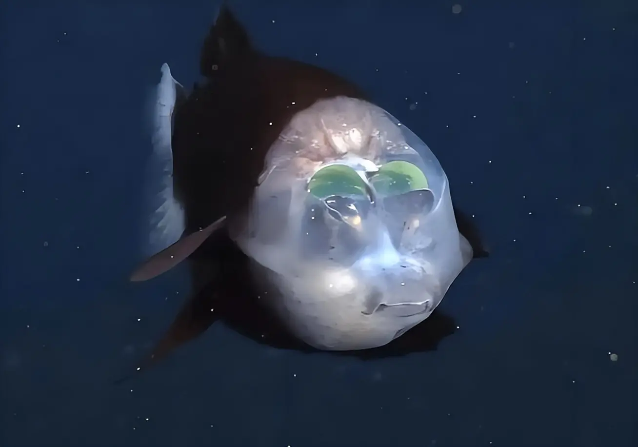 虽然相比之下,在深海里的活体稍微好看一些,但也有些不符合我们对常规鱼类外观的认识,因为它整个头部的上半部分几乎是透明的,眼睛在里面就是上图中绿色的部分,这让它看起来更加的诡异,它就是在1939年就被发现的生活在超过600米水深海底的管眼鱼。