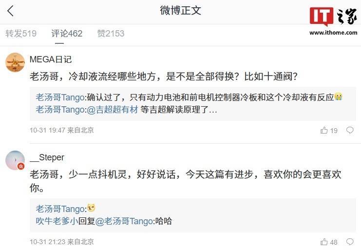 IT之家注意到,汤靖还在评论区与网友展开互动,针对“冷却液流经哪些地方,是不是全部得换?比如十通阀?”的提问,他回复:“确认过了,只有动力电池和前电机控制器冷板和这个冷却液有反应。”